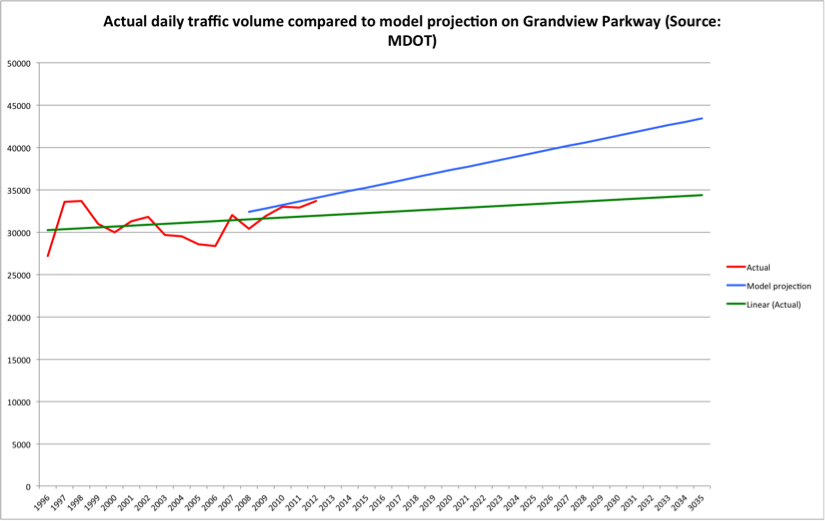 Here’s a chart that shows actual traffic counts on Grandview compared to MDOT’s traffic projections.